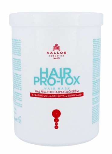 Hair Pro-Tox Hair Mask to maska do włosów z keratyną, kolagenem i kwasem hialuronowym od firmy Kallos. Do pielęgnacji włosów suchych, zniszczonych i łamliwych. Głęboko nawilża, odżywia włosy i skórę głowy. Wykazuje działanie intensywnie regenerujące. Zapobiega rozdwajaniu końcówek. Po aplikacji włosy stają się miękkie w dotyku i niezwykle lśniące..