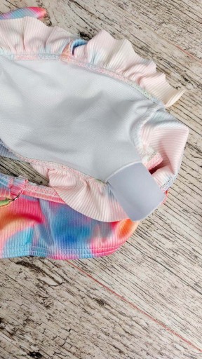 Kostium prążkowany w pięknej pastelowej kolorystyce. Przy staniczku ozdoba w postaci efektownego wiązania, natomiast miseczki zdobione uroczą falbanką .Góra kostiumu posiada regulowane ramiączko, dzięki czemu jest go łatwo dopasować do sylwetki. Klasyczny krój majteczek. W zestawie spódniczka z falbanką do kompletu w kolorystyce kostiumu. Idealny dla dzieci lubiących aktywnie spędzać czas podczas wakacji. Stanik posiada wkładki, które można wyjąć. Kostium bardzo dobry jakościowo, posiada w przedniej części podszewkę.