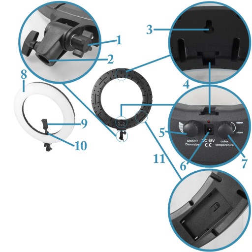 Łatwy montaż na statywie studyjnym ze standardową końcówką 16 mm umożliwia regulowane ramię z mocowaniem zaciskowym, zapewniając komfortową pracę z lampą. Wewnętrzna powierzchnia odbijająca pozwala na dużą wydajność świecenia, a kształt okręgu sprawia, że fotografowany obiekt oświetlony jest równomiernie ze wszystkich stron i nie trzeba dostarczać innych źródeł światła.