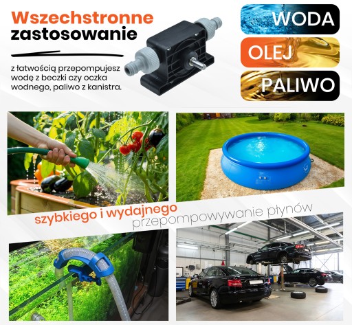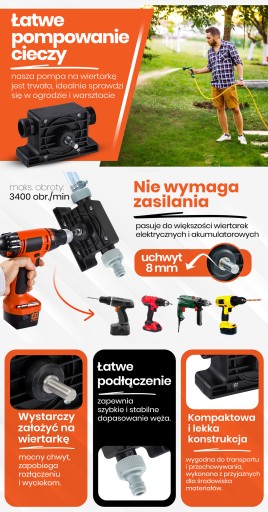 Mini-pompa na wiertarkę to praktyczne narzędzie przydatne w każdym gospodarstwie domowy, które umożliwia przepompowywanie płynów z jednego miejsca do drugiego za pomocą wiertarki lub wkrętarki z uchwytem na trzpień 8 mm. Urządzenie to pozwoli szybko i sprawnie wypompować wodę z różnych zbiorników np. akwarium, beczek, basenu, itp.. Może być wykorzystywana do przepompowywania np. olejów, cieczy chemicznych i innych płynów. Jest przydatna w przypadku konieczności szybkiego i wydajnego przemieszczania płynów z jednego miejsca do drugiego, szczególnie w sytuacjach, w których dostęp do tradycyjnych pomp jest utrudniony. Mini-pompa również dobrze sprawdzi się wtedy gdy musimy wypompować paliwo z baku. Pompka zachowuje niezmiennie swoje właściwości przy wodzie. Przy innych płynach parametry oraz żywotność urządzenia mogą być ograniczone.
