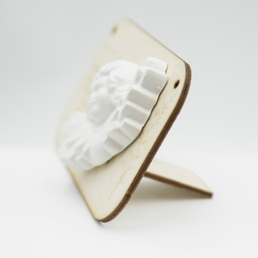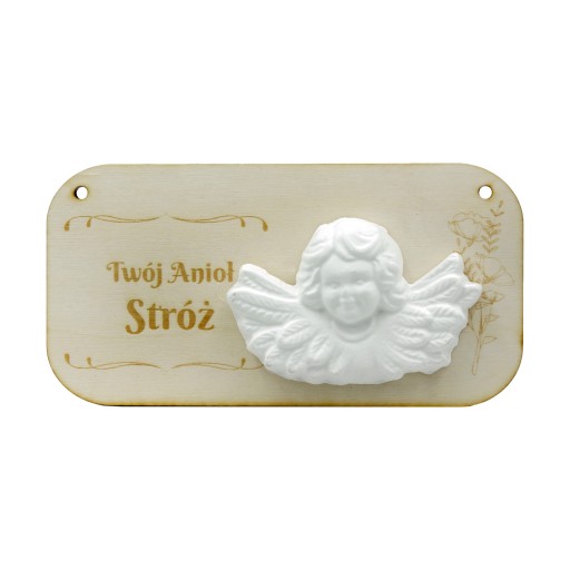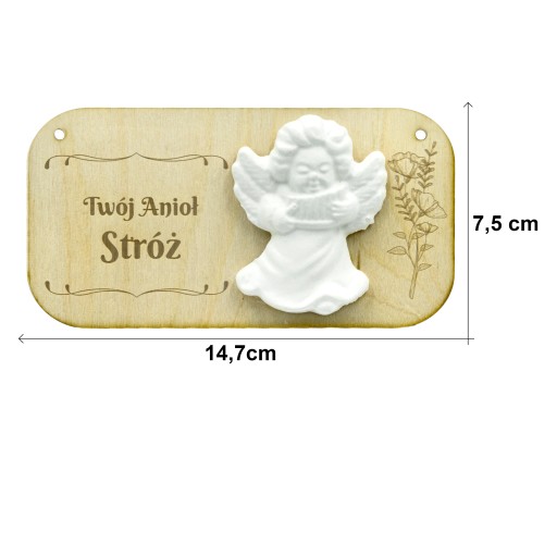 Piękna pamiątka z drewna brzozowego, grawerowana. Figurka gipsowa anioła naklejona na tabliczkę. W rezultacie utrzymujecie Państwo podziękowanie gotowe do wręczenia Gościom.