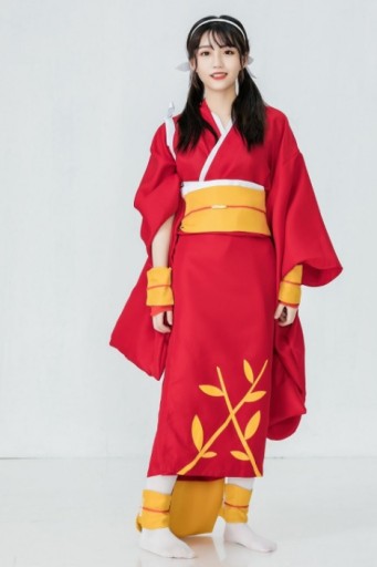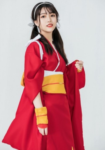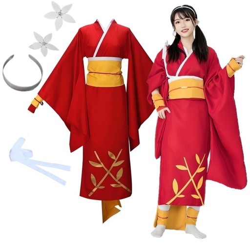 - Kostium zakładany w postaci czerwonego kimona, łatwy w ubieraniu,