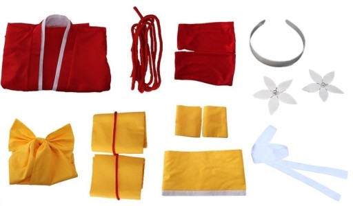 - Zestaw 11 części: kimono, pas, linka do wiązania w pasie, przypinka kokarda, sznurki, opaski ochronne na łydki, opaski ochronne na nadgarstki wraz z czerwonymi rękawkami, opaska na włosy, spinki-kwiatki oraz biała wstążka,