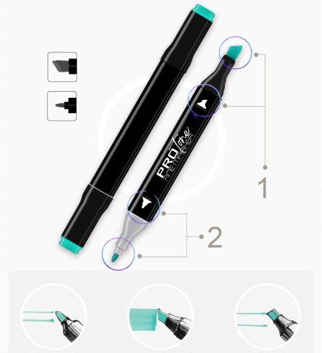 Dwie końcówki - szeroka-płaska oraz cienka-punktowa - dają ogromne możliwości twórcze. Końcówki wykonano z odpornego na ścieranie tworzywa, dzięki czemu markery będą służyć przez długi czas. Włókno końcówek nie rozwarstwia się, nie oddziela i nie podcieka. Nasączony tuszem wkład wykonany został w sposób gwarantujący równomierną dystrybucję tuszu - bez wysychania, wylewania i plam!