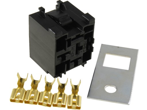 Element pozwala na prawidłowe zamontowanie i podłączenie przekaźnika. W skład zestawu wchodzą konektory umożliwiające podłączenie przewodów. Podstawa przystosowana do wpięcia przekaźnika z 5 pinami.