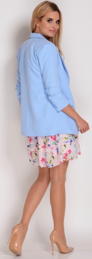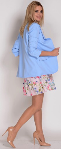 Model dłuższy, smokingowy pasujący do eleganckiego jaki i casualowego stylu. Doskonałe dopełnienie stylizacji do pracy, na uczelnie lub na wieczorne wyjście. Oryginalnego charakteru dodają drapowane rękawy o długości 3/4. Dwie kieszonki po bokach z efektownymi klapami upiększają marynarkę. Fason luźny, z podszewką i miękkimi poduszkami w ramionach.