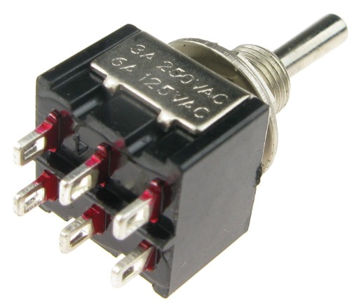 Przełącznik dźwigienkowy chwilowy (hebelkowy). Podwójny, (ON)-OFF-(ON), 6 pinów, 3 pozycje - wychylenie w górę lub w dół jest chwilowe, po puszczeniu dźwignia powraca do pozycji środkowej. 3A/250VAC (6A/125VAC). Wymiary: 12,7x13,2mm, dźwignia 11mm, pod otwór ok. 6mm. Uwaga - gwint w tym przełączniku jest drobny, nie pasuje on do osłonek do przełączników MTS dostępnych na moich aukcjach.