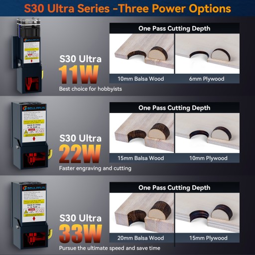 Ulepszone trzy opcje lasera 11W, 22W, 33W: Laser serii S30 Ultra wykorzystuje pojedynczą ulepszoną diodę 6W, co zwiększa jego rzeczywistą moc lasera i możliwości cięcia, a także zapewnia trzy opcje lasera 11W/22W/33W.