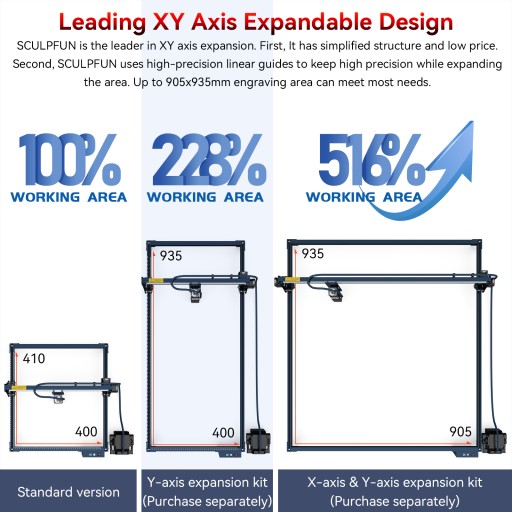 Rozszerzalny obszar grawerowania w podwójnej osi XY: seria S30 przyjmuje innowacyjną rozszerzalną konstrukcję osi XY, oryginalny obszar grawerowania ma około 400 x 400 mm, można kupić zestaw rozszerzenia osi Y, aby rozszerzyć obszar grawerowania do 935 x 400 mm; kupić zestaw rozszerzenia osi XY, aby ulepszyć maksimum 935x905mm Obszar grawerowania, który pomoże Ci lepiej radzić sobie z dużymi zadaniami grawerowania lub cięcia.