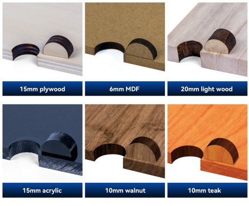 Materiał do cięcia: wszystkie rodzaje drewna (w tym orzech, wiśnia i inne drewno o dużej gęstości), MDF, akryl, karton, bambus, niektóre plastikowe płyty, skóra, płyty PCB