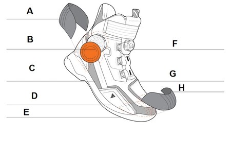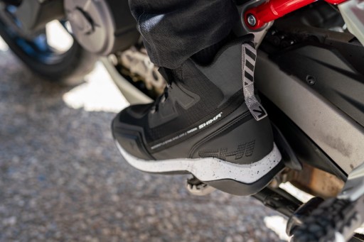 - model TAKESHI został wyposażony w oddychający materiał, klin ułatwiający odnalezienie odpowiedniej pozycji nogi na podnóżku oraz gumowaną nakładkę do zmiany biegów.