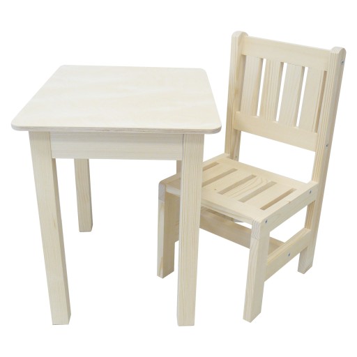 Komplet składa się ze stolika oraz krzesełka. Wykonany został z drewna świerkowego nie pokrytego lakierem. Komplet doskonale uzupełni umeblowanie pokoiku Twojego dziecka sprawi, że jego wnętrze stanie się ciepłe i radosne. Mebelki są funkcjonalne i nie zajmują dużo miejsca. Krzesełko jest bardzo wygodne, a stolik zapewnia wystarczającą ilość miejsca do zabawy. Twoje pociechy odnajdą przy nim doskonałe miejsce do zabawy, rysowania i malowania, a nawet spożywania posiłków.
