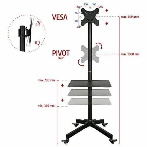 • Kilka rodzajów regulacji - wysokość podstawki regulowana od 100 cm do 148 cm, funkcja PIVOT - obrót o 360 °, półka może pomieścić laptopy, odtwarzacze, dekodery czy konsole do gier do 4 kg, półkę można również regulować na wysokość od 36cm do 70cm.