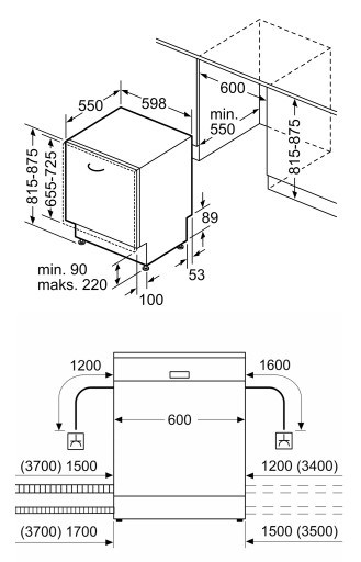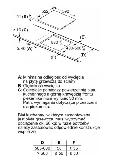 - Wymagane wymiary montażowe wnęki (WxSxG mm) : 51 x 560 x (490 - 500)