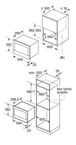 - Wymiary niszy (WxSxG): 362 mm - 382 mm x 560 mm - 568 mm x 300 mm