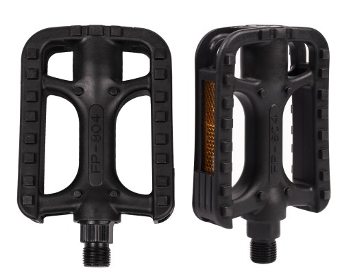 Pedały z tworzywa sztucznego, posiadają wypustki które zapobiegają ześlizgnięciu się stopy, wyposażone w odblaski