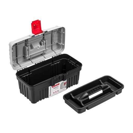 Głęboka tacka z miejscem na nasadki i bity oraz dodatkowe żebrowanie pokrywy tworzą bardzo solidną skrzynkę. Samopozycjonujące się zapięcie zapobiega nieprawidłowemu zamknięciu.