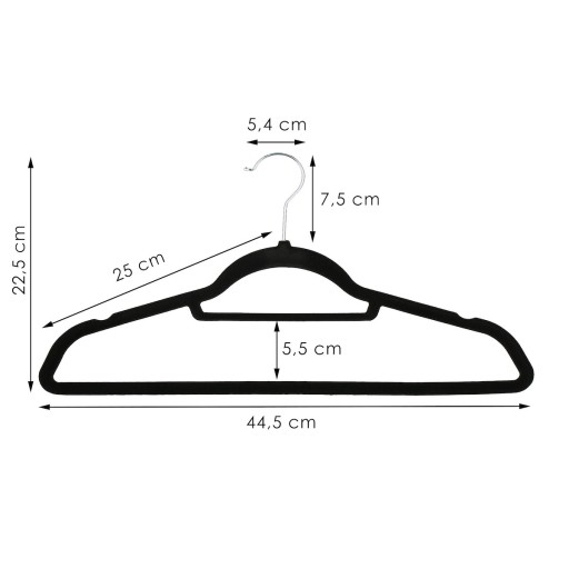 Opływowy kształt wieszaka sprawia, że ubrania stabilnie trzymają się jego powierzchni. Dodatkowym atutem produktu jest wykończenie welurowe i specjalne wcięcia po bokach, dzięki którym bluzki, koszule, marynarki i sukienki nie zsuwają się.