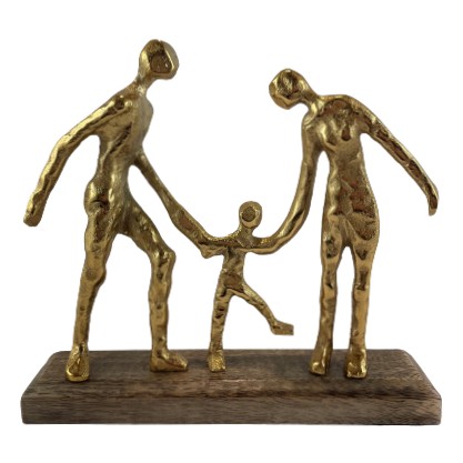 Oryginalna figurka z wizerunkiem rodziny w kolorze złota na drewnianej podstawie. Sprawdzi się jako ozdoba mieszkania w stylu klasycznym, jak i nowoczesnym. Jej niepowtarzalny design sprawi że nikt nie przejdzie obok niej obojętnie. Doskonały prezent.
