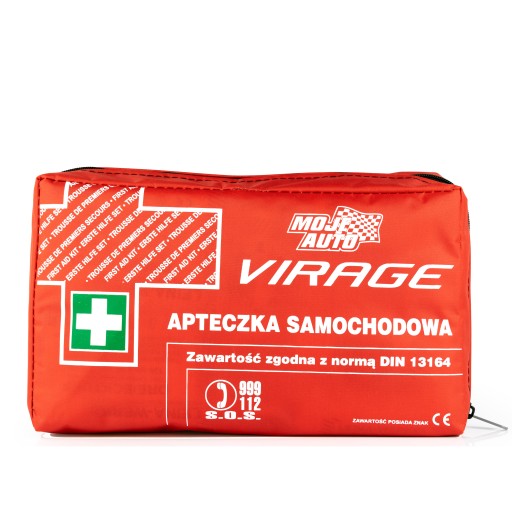 Apteczka samochodowa w saszetce z przylepcem umożliwiającym zamocowanie apteczki do tapicerki. Apteczka spełnia wymagania norm UE. Skład zgodny z normą DIN 13164.