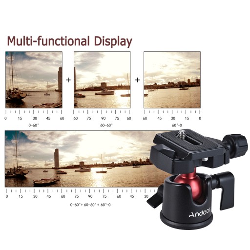 Andoer mini głowica kulowa ze stopu aluminium do statywu stołowego. Kula 25 mm umożliwia fotografowanie pod kątem pionowym i poziomym. Szybkozłączka 1/4 "do szybkiego montażu kamery. Średnica dna 4cm / 1,6", gwint dolny 3/8 ".