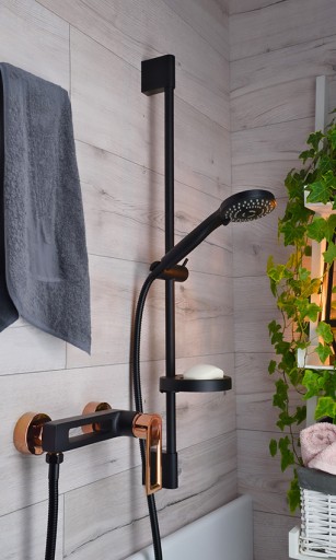 Czarno złoty zestaw łazienkowy SOTBE LOFT SVART GOLD Zestaw bateria prysznicowa + bateria umywalkowa stojąca + drążek prysznicowy 80 cm z dodatkami w kolorze modnego różowego złota GOLDEN ROSE