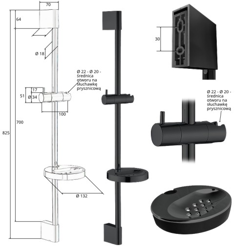 ✅ Regulowany czarny drążek prysznicowy SOTBE LARK z mydelniczką LARK-DC60-23534333