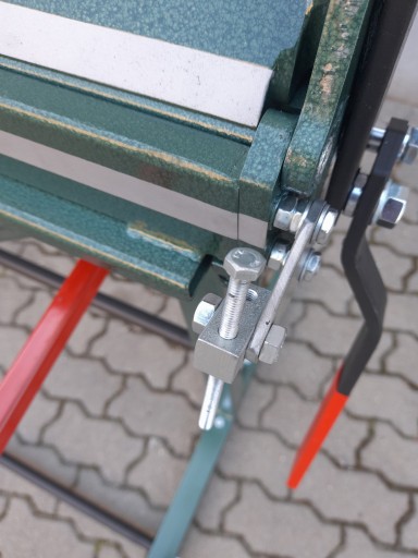 Sprzedawana zaginarka jest wyposażona w dwupozycyjny ogranicznik kąta gięcia OK pozwalający zachować jednakowy kąt gięcia w przypadku wykonywania serii jednakowych zagięć. Zaginarka posiada również zderzak przedni (ogranicznik przesuwu blachy) który jest przydatny przy cięciu blachy na pasy.