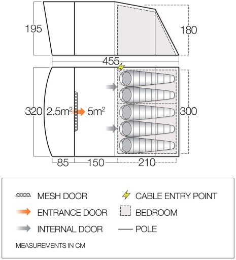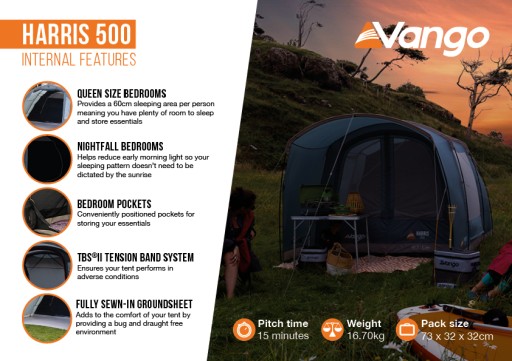 Vango Harris 500 to 5-osobowy namiot zaprojektowany z myślą o doskonałej wentylacji. Ten namiot ma wiele paneli z siatki w tym panel z siatki za sypialniami, aby zmaksymalizować wentylację i utrzymać namiot w chłodzie podczas upalnych dni. Tkanina Sentinel utrzymuje niewielki rozmiar i wagę spakowanego namiotu, zapewniając jednocześnie jakość i trwałość gwarantowaną przez markę Vango. Sypialnie Nightfall zapewniają dłuższy sen, a na stałę przymocowany przedni baldachim zapewnia doskonałe miejsce do spożywania posiłków i relaksu, oferując dodatkową przestrzeń życiową i prawdziwą atmosferę na świeżym powietrzu. Harris to idealny namiot rodzinny na letnie wypady.