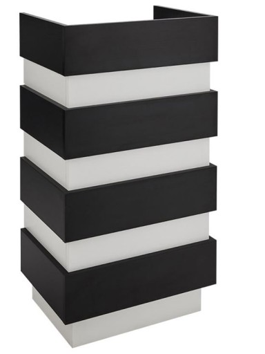 Korpus recepcja fryzjerska Reno mini został wykonany z białej płyty laminowanej, z ozdobnymi pasami w kolorze czarnym. Posiada jedną głęboką, wysuwaną szufladę oraz zamykaną szafkę.