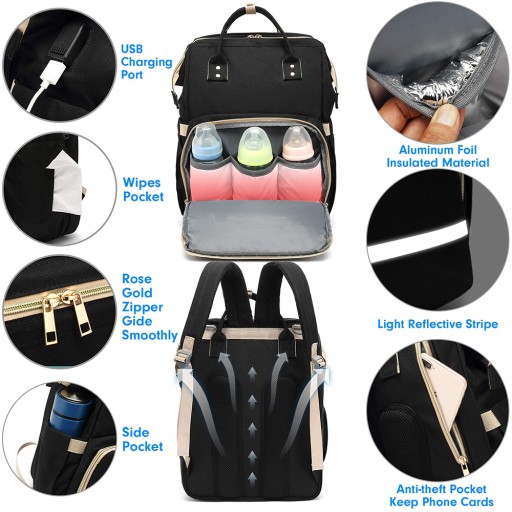 - Plecak posiada wiele kieszeni do przechowywania najpotrzebniejszych rzeczy, takich jak pieluchy, śliniaki, kremy, chusteczki nawilżane i wiele innych.