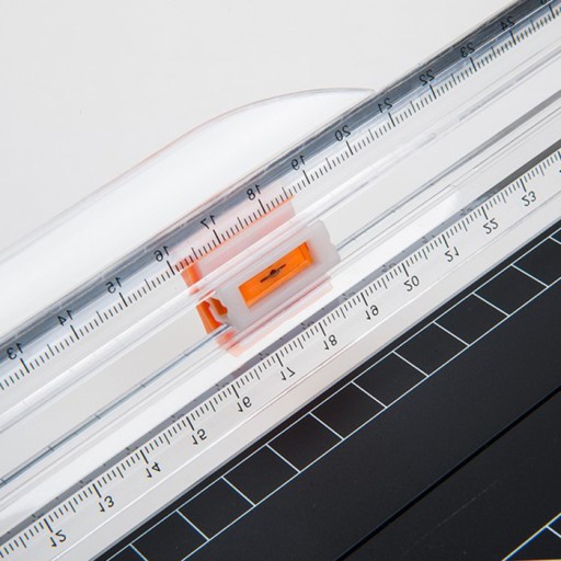 - Gilotyna dzięki bardzo ostremu trymerowi zapewnia precyzyjne cięcie papieru wzdłuż linii prostej. Cięte krawędzie są równe i gładkie. Ostrze trymera schowane jest wewnątrz prowadnicy, wysuwa się po wciśnięciu.