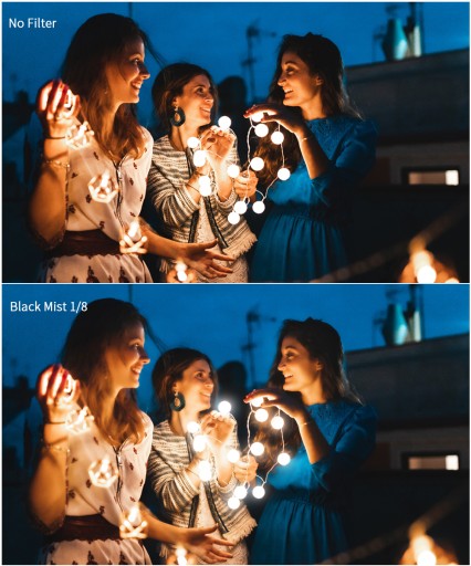 Dodatkowo dzięki filtrom Black Mist wszelkie niedoskonałości fotografowanych i filmowanych obiektów, szczególnie w fotografii portretowej, takie jak: odcienie skóry, zmarszczki, pory skórne itp. stają się zmiękczone i wygładzone, zanikają. Dookoła źródeł światła natomiast powstaje klasyczna, delikatnie wyglądająca poświata.