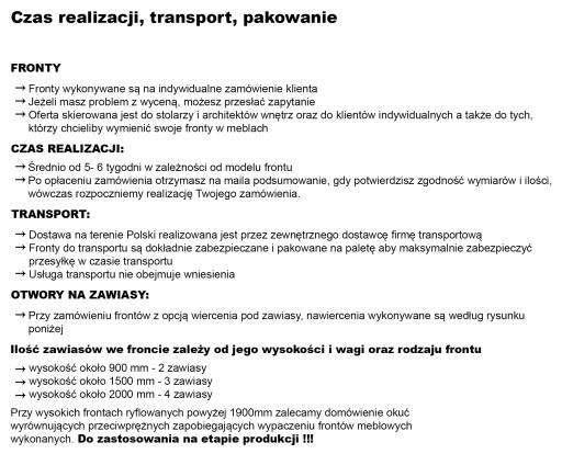 - Nawiercenia pod zawiasy standardowo fronty bez nawierceń pod zawiasy. Zamówione fronty można dodatkowo nawiercić pod zawias. Cena za jeden otwór 8,80 zł