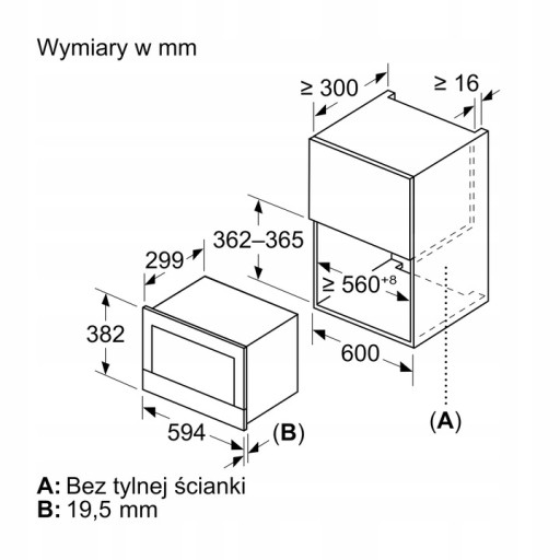 - Wymiary niszy (WxSxG): 362 mm - 382 mm x 560 mm - 568 mm x 300 mm