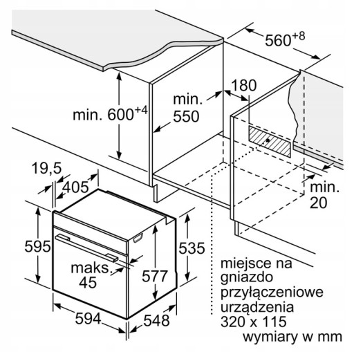 - Wymiary niszy (WxSxG): 585 mm - 595 mm x 560 mm - 568 mm x 550 mm