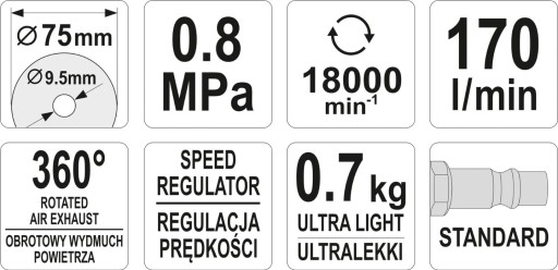 Opis produktu Profesjonalna przecinarka pneumatyczna zasilanaTástrumieniem sprężonego powietrza pod ciśnieniem.TáZa pomocą tarcz tnących umożliwia przecinanie metalu,Táelementów karoserii, konstrukcji blaszanych.TáStosowana w serwisach motoryzacyjnych i w przemyśle. średnica tarczy: 75 mm ciśnienie: 0,8 MPa wydajność: 170 l/min maks. prędkość obrotowa: 18 000 obr./min płynna regulacja prędkości obrotowej obrotowy wydmuch powietrza 360T- lekka, kompozytowa obudowa i niewielkie wymiaryTázapewniają komfortową pracę osłona tarczy blokadaTáwe włącznikuTázabezpieczaTáprzed niepożądanymTáuruchomieniem standardowe przyłącze Dane techniczne Numer indeksu YT-09717 EAN 5906083044441 Marka Yato Ciśnienie robocze [MPa] 0,63 Wydajność [l/min] 170