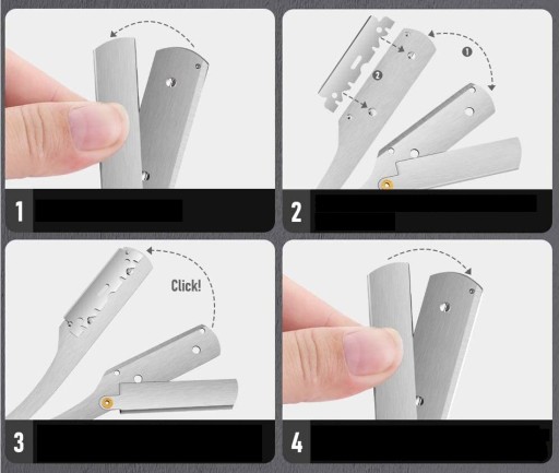 Następnie należy podnieść nakładkę brzytwy, umieścić połowę żyletki pomiędzy bolcami i zamknąć nakładkę.