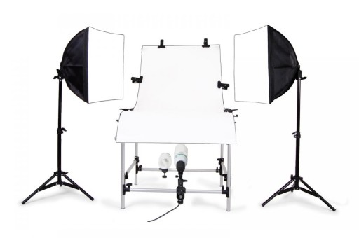 Profesjonalny oświetleniowy zestaw studyjny, dedykowany do fotografii produktowej. Dzięki niemu przedmioty po sfotografowaniu nie będą wyglądały płasko, a będą sprawiały wrażenie trójwymiarowości.