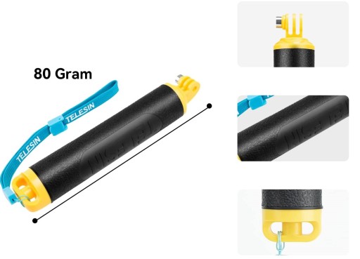 NAJWAŻNIEJSZĄ ZALETĄ uchwytu jest natomiast jego specyficzna budowa. Uchwyt posiada detale w kolorze żółtym i został wykonany z tworzywa sztucznego, które nie tonie. Dzięki temu zamocowana kamera w uchwycie nie zatonie, gdy wypadnie nam z ręki w trakcie jej użytkowania. Dodatkowo kolor żółty w sposób szybki i łatwy pozwala na zlokalizowanie kamery, która nam wypadła.