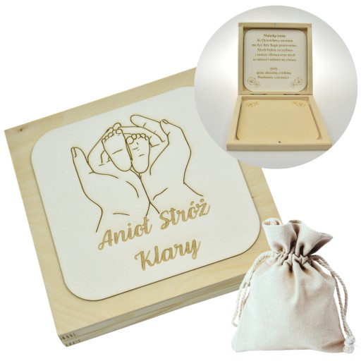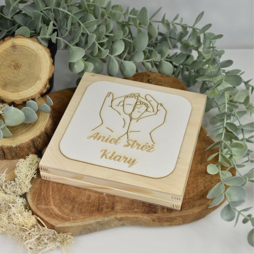 - Drewniane pudełko o wymiarach: 14,5 cm x 14,5 cm i wysokości 2,5 cm z wybranym emblematem na wieczku oraz spersonalizowanymi życzeniami w środku pudełka.