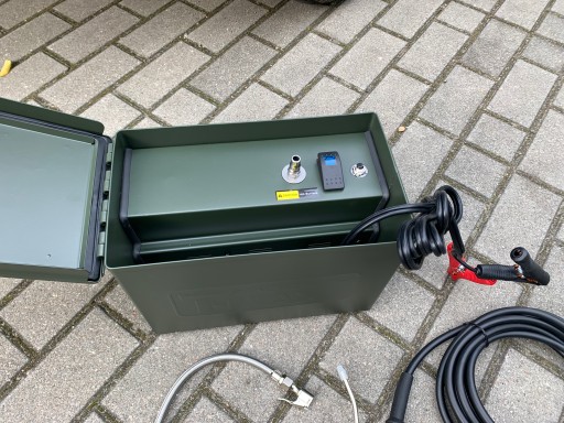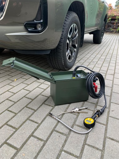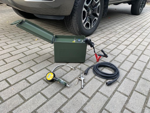 Wyposażenie: kompresor , przewód szybkozłączny sprężysty z manometrem, kable podłączeniowe do akumulatora oraz metalowa kaseta.