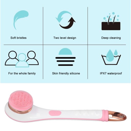 4. PODWÓJNY POZIOM KONSTRUKCJI: Elektryczna szczotka do mycia ciała obsługuje automatyczne czyszczenie obrotowe, pierwszy poziom to niska prędkość, odpowiednia dla skóra wrażliwa, drugi poziom to duża prędkość, do codziennego szorowania