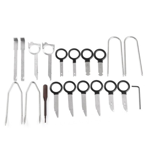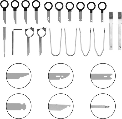 20-elementowy uniwersalny zestaw do demontażu radia i nawigacji. Zestaw umożliwia demontaż praktycznie każdego radia samochodowego. Niezastąpiony w serwisach zajmujących się nagłośnieniem CAR-audio.