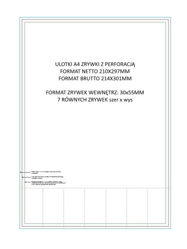 - perforacja wykonana w poziomie na dole ulotki podzielona na 7 pól w formacie 30x55mm