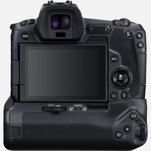 - Obiektyw EOS R umożliwia dłuższe fotografowanie. Ma pionowy uchwyt obsługujący dwa akumulatory litowo-jonowe LP-E6N o wysokiej pojemności oraz akumulatory LP-E6,