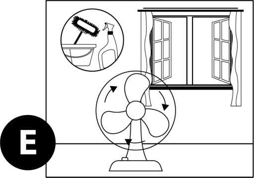 5️⃣ Po skończonym zabiegu starannie wywietrzyć pomieszczenie przez ok. 1 godz. Przed ponownym użytkowaniem umyć powierzchnie blatów, stołów i innych powierzchni.