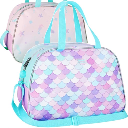 Duża, pojemna torba, pojemna komora, pastelowy wzór łusek Syrenki, regulowany pasek na ramię, wytrzymały zamek błyskawiczny. Torba w różowo-fioletowo-seledynowych pastelowych kolorach.