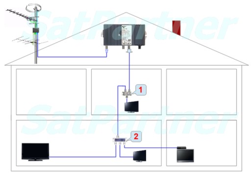 Ze względu na układ mieszkania, często wygodniejszy jest inny niż gwiazdowy sposób podłączenia odbiorników - użycie gniazdek przelotowych lub kilku mniejszych rozgałęźników połączonych szeregowo.