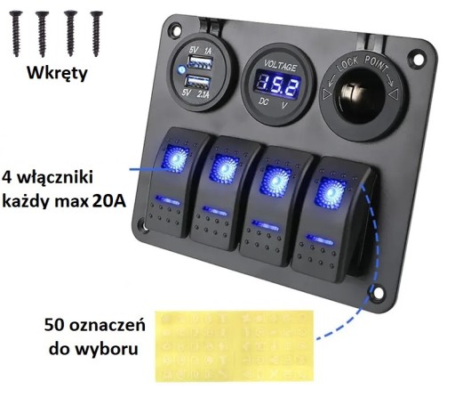 Podświetlany panel włączników z ładowarką USB i zapalniczką
